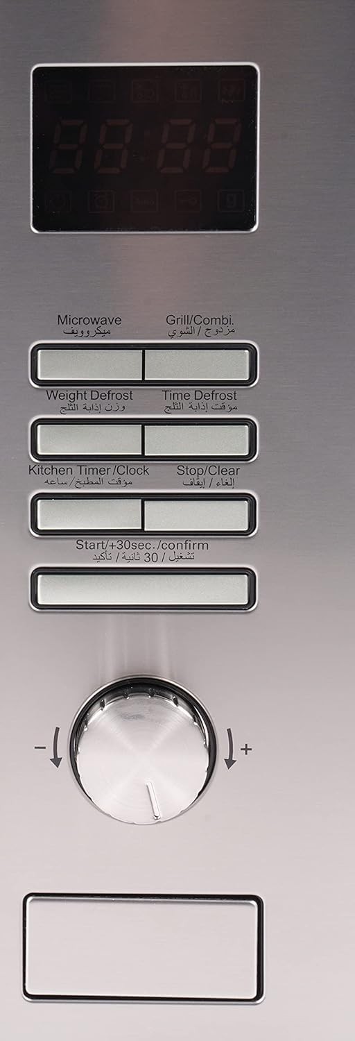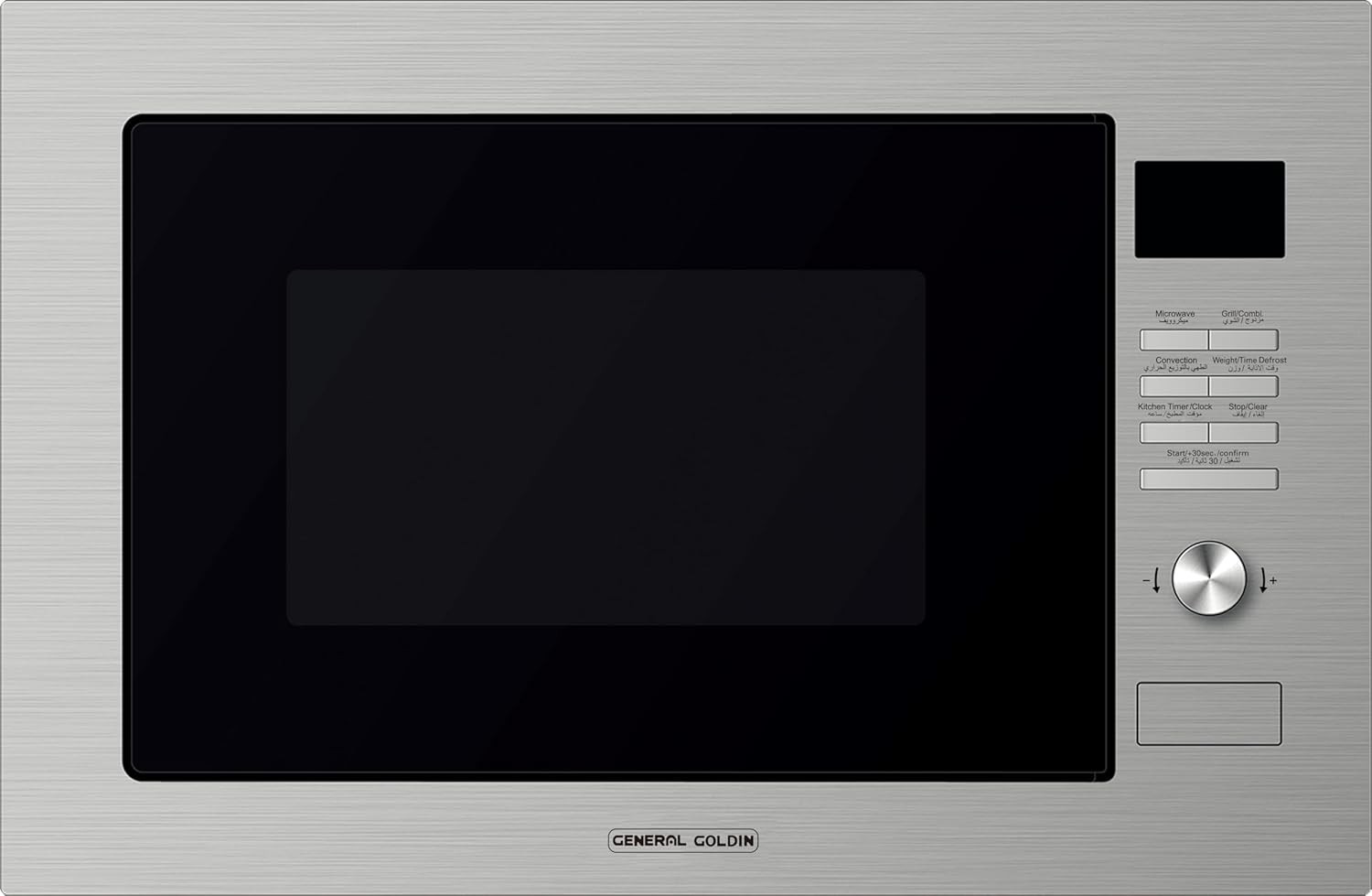 فرن ميكروويف مدمج من جنرال جولدن بجهد 220 فولت/60 هرتز بواجهة وفتحات من الفولاذ مع شواية وزجاج أسود ومزود بلوحة تحكم أنيقة وسهلة الاستخدام تعمل باللمس. تأتي مع شواية وخاصية طهي متعددة المراحل. مناسب للعائلات الكبيرة. يسخن المقالي الكبيرة والطناجر بسرعة وسهولة. مما تمنحك المزيد من الوقت للاستمتاع بتناول الوجبات. يأتي بسعة 34 لترًا.