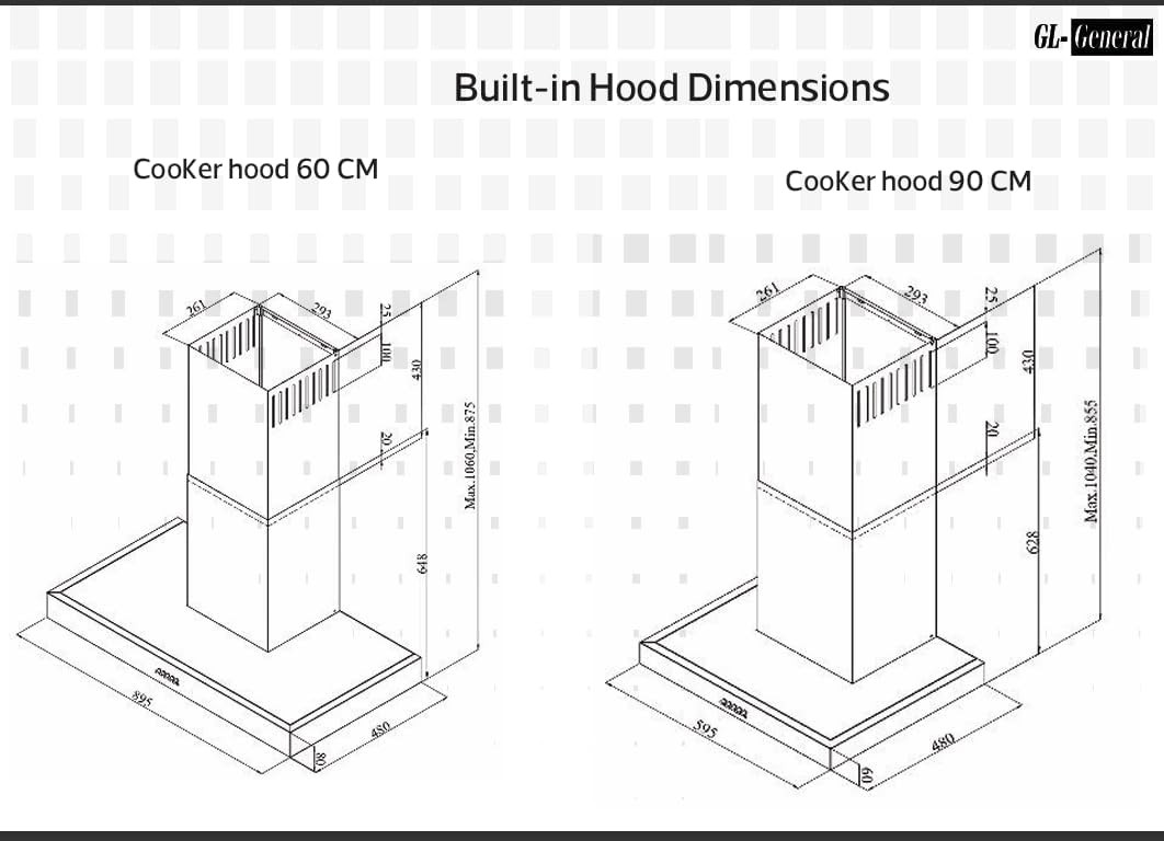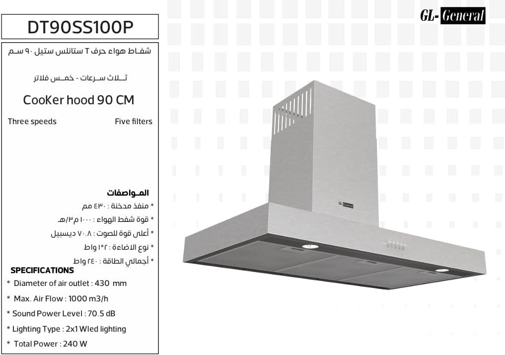 شفاط جي ال جنرال 90سم ستيل حرف T فلتر المنيوم 5 طبقات 3 سرعات- DT90SS100P
