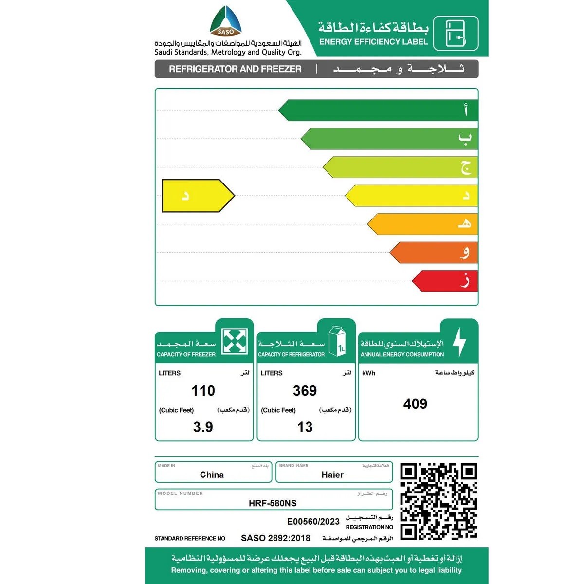 صافي سعة الثلاجة: 13 قدم