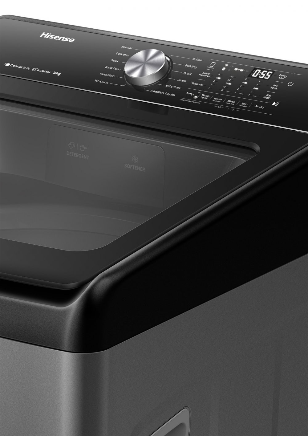 غسالة أوتوماتيك ذكية من هايسينس بتحميل علوي 15 كغم، محرك عاكس، ضوضاء أقل، استهلاك الطاقة، تحكم ذكي، 12 برنامج، رمادي، رقم الموديل: WT15RB، محرك عاكس، تحكم خلفي، تايد ووش، كونيكت لايف، وظيفة توفير المياه، وظيفة النقع المسبق، تقنية التحكم المنطقي الذكي المخملي، وظيفة البرمجة الذاتية، مداخل مياه مزدوجة، مضخة مع فلتر، وظيفة قفل الأطفال، وظيفة تأخير الوقت 2 ~ 24 ساعة، اكتشاف الأخطاء عن طريق التشخيص الذاتي