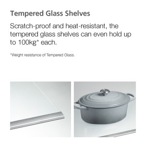 مقاومة للخدش ومقاومة للحرارة، يمكن للأرفف المـصنوعة من الزجاج المقسّى استيعاب ما يصل إلى 100 كغ* لكل منها.