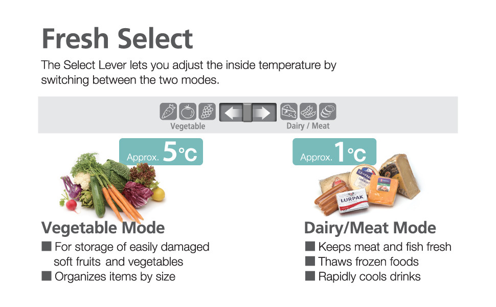 تتيح لك أذرع الاختيار ضبط درجة الحرارة في كل جانب من المقصورة عن طريق التبديل بين وضعي الخضروات والألبان/اللحوم. ويمكنك تحريك الفاصل لتغيير حجم المناطق اليسرى/اليمنى.