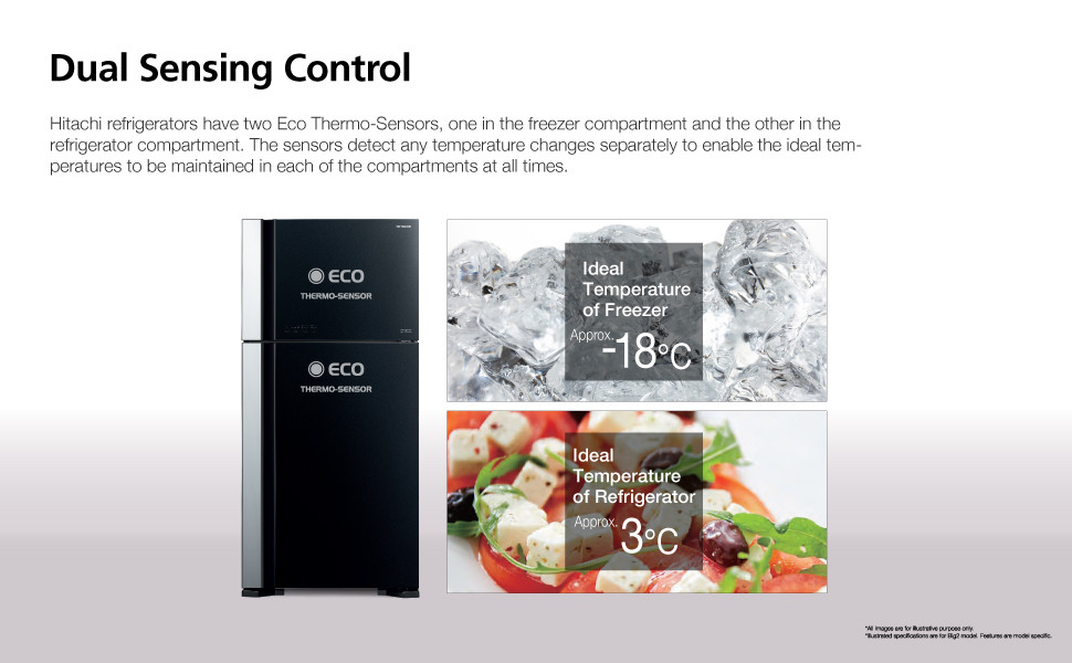 تحتوي ثلاجات هيتاشي على مستشعرين حراريين صديق للبيئة، أحدهما في حجرة التجميد والآخر في حجرة الثلاجة. تكتشف المستشعرات أي تغيرات في درجة الحرارة بشكل منفصل لتمكين الحفاظ على درجات الحرارة المثالية في كل مقصورة في جميع الأوقات.