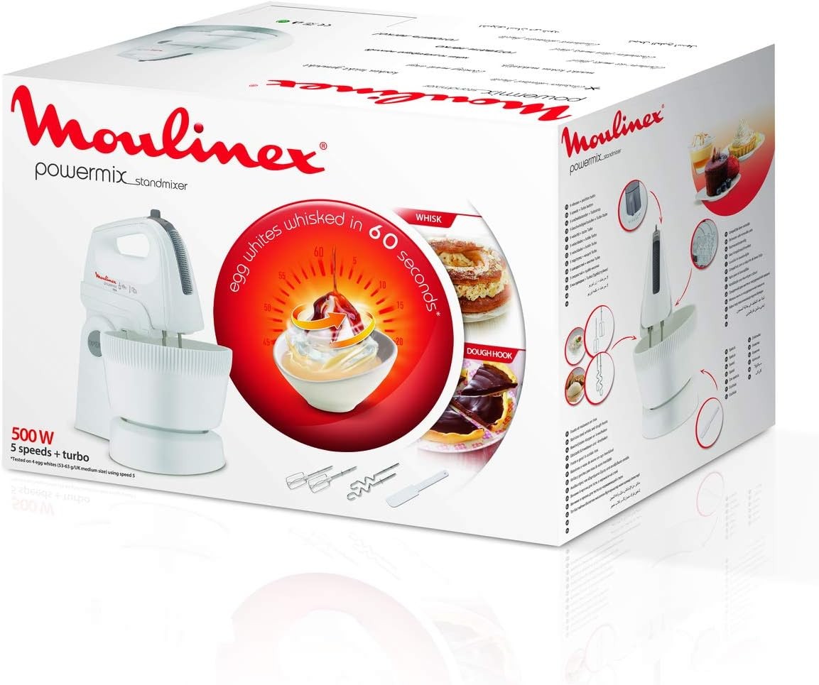 خلاط يدوي بإمكانيات خبز فائقة لا حصر لها. محرك قوي بقوة 500 واط مع 5 سرعات لسهولة التكيف مع تجهيز الوجبات اللذيذة التي تقوم به يمكنك إعداد الوجبات في وعاء بخافق محمول مائل بدوران تلقائي سعة 3.3 لتر لتجميع جميع المكونات في الوعاء، مما يمنحك نتائج رائعة أثناء الخفق والخلط. كما أنها تسمح لك بمزج حتى الكميات الصغيرة. ملحقات أساسية للخبز في مطبخك دائمًا وفي متناول يدك: خفاقتين من الستانلس ستيل لخفق بياض البيض وخفق الكريمة مع خطافي لعجن العجين من الستانلس ستيل. آمن للاستخدام في غسالة الصحون