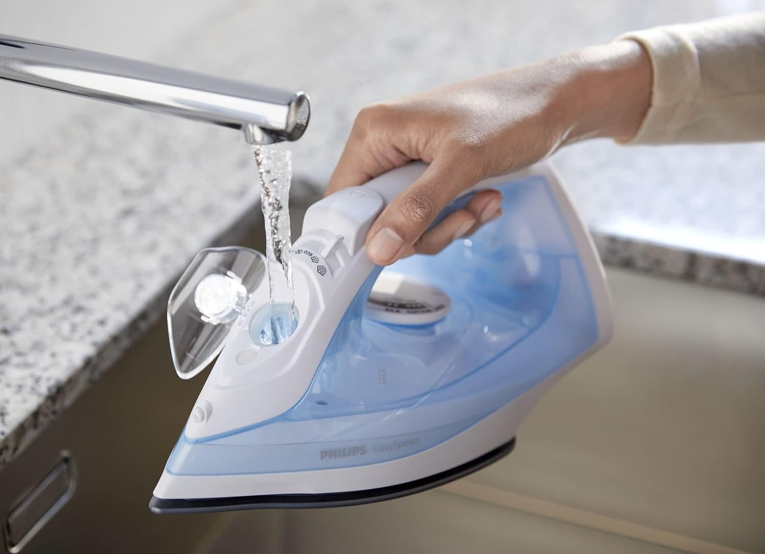 يمكن استخدام هذه المكواة البخارية مع مياه الحنفية العادية، وتسهّل حاوية تنظيف الكلس إزالة أي ترسبات كلسية متراكمة في المكواة. للحفاظ على أداء المكواة البخارية من Philips، يجب استخدام وظيفة تنظيف الترسبات الكلسية هذه مرة في الشهر عند استخدام مياه الحنفية.