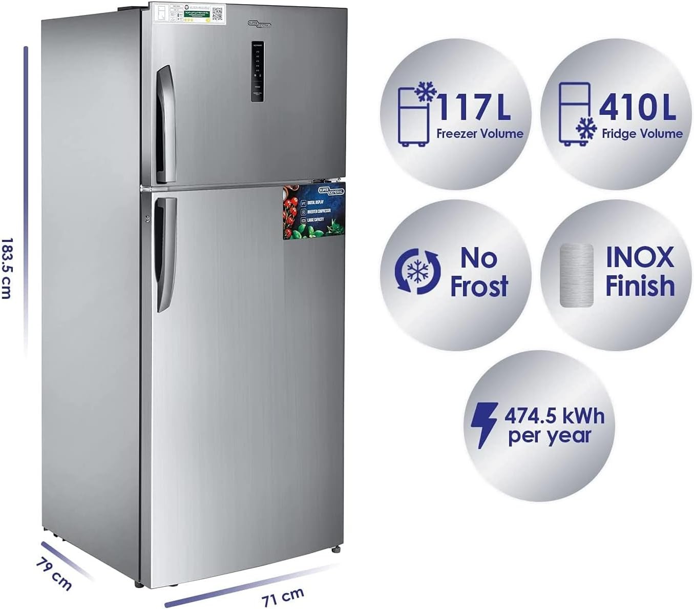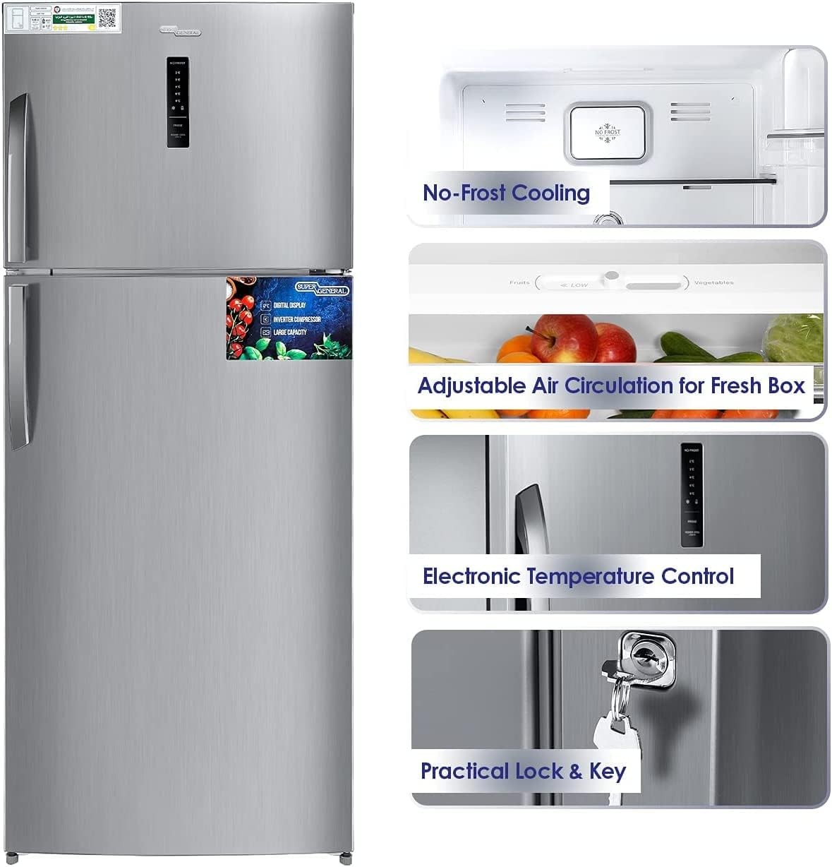ثلاجة ببابين طراز KSGR710I من سوبر جنرال للتغلب على الحرارة والاستمتاع بالمشروبات الباردة والطعام الطازج والمجمد طوال اليوم. مصنوعة من مواد عالية الجودة، سهلة التنظيف والصيانة. مع إضاءة LED داخلية عملية ونو فروست كامل. واسعة وموفرة للمساحة بأرفف متعددة وحجم تخزين كبير تتميز بكونها مثالية للمطبخ الكبير وغرفة المعيشة وصالة الألعاب الرياضية والمتاجر والمطاعم. متوفرة بلمسة نهائية شبه لامعة ولطيفة لتصميم عصري مثالي. 【المميزات】مزيج يجمع بين ثلاجة وفريزر ببابين وبتصميم يمكن قفله بالمفاتيح. مجهزة بالكامل بخاصية نو فروست وقفل ومفتاح ورفوف متعددة. تتمتع هذه الثلاجة المدمجة مقاس XL بمقبضين وأرفف زجاجية متينة مع ارتفاعات قابلة للتعديل لتخزين الكعك واللحوم والحليب والبيض والمشروبات. قم بتخزين الايس كريم والخضروات المجمدة في الفريزر العملي. مزيج ثلاجة وفريزر قائم بذاته مثالي لمن يعيشون بمفردهم في المجمعات السكنية والتجمعات العائلية حيث أنه مزوّد بقفل ومفتاح. تتميز هذه الثلاجة متعددة الوظائف أيضًا بالتحكم الإلكتروني في درجة الحرارة، وشاشة رقمية، وماكينة لصنع الثلج، وسرعة تبريد فائقة، ومستوى ضوضاء منخفض، وضاغط عالي الكفاءة، وقفل للأطفال، وإضاءة داخلية للثلاجة ومبرد R600a. هذا المزيج بسعة إجمالية 538 لتر ومتوفر باللون الفضي.