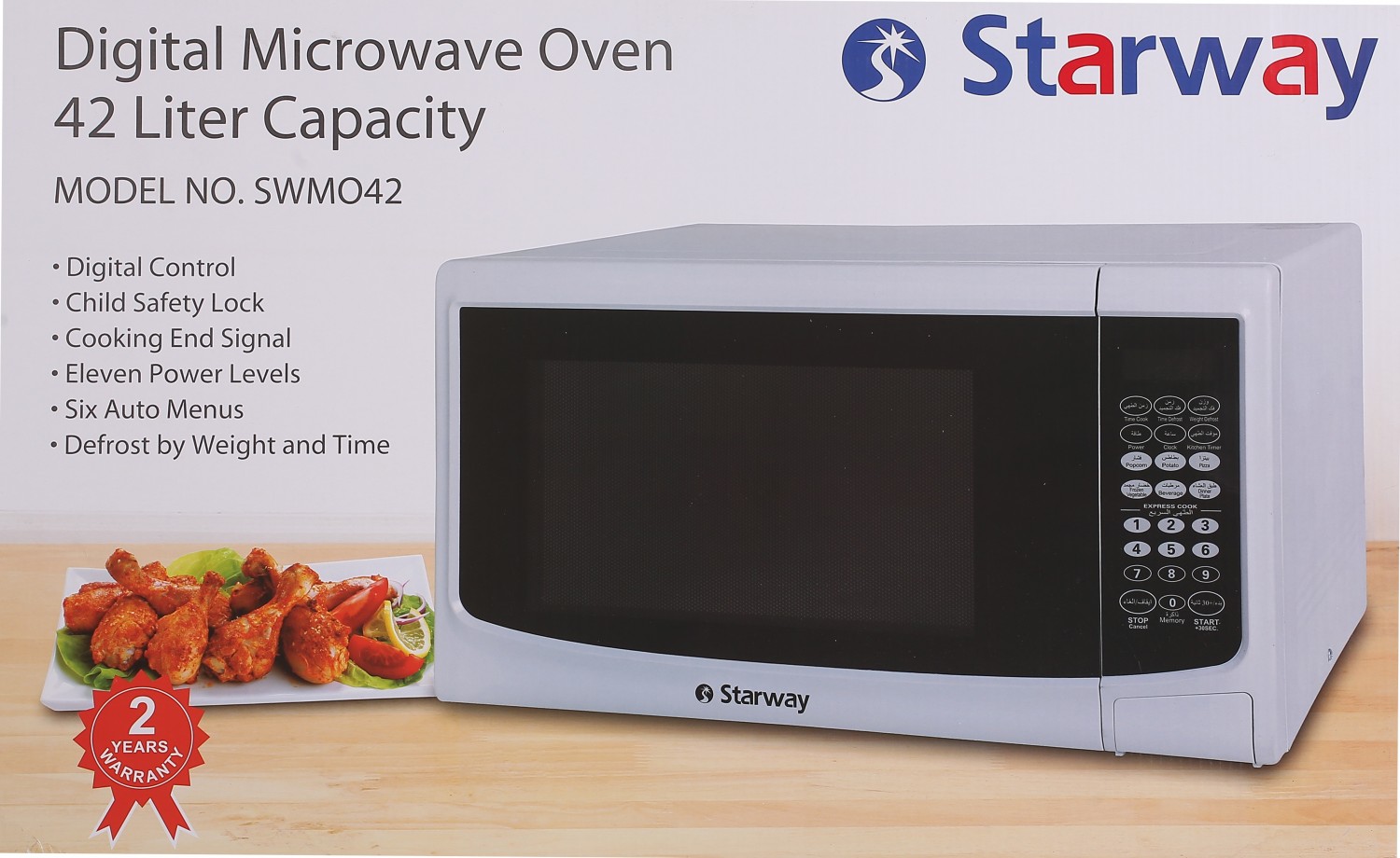 يتميز فرن الميكروويف بقدرة 42 لتر لتسخين طعامك. مع نظام تسخين 1550 واط، يمكن للميكروويف تسخين وطهي طعامك في وقت قصير ويسمح لك بالاستمتاع بطبقك المفضل في وقت قصير. يمكن أن توفر لك شاشة العرض الكهربائية عالية التقنية معلومات قيمة تتعلق بطهيك. يعرض رقم القائمة والتوقيت والإعدادات والمزيد ليتم إخطارك دائمًا بما تفعله.